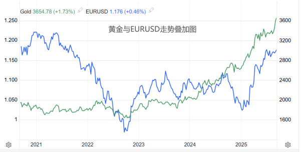 7月30日至今,伦敦金从最低点3267美元涨至最高3659美元,累计涨幅约12%;同期,EURUSD从最低点1.1390涨至最高点1.1779,幅度389点,幅度3.4%,约为黄金涨幅的四分之一。除了涨幅外,上涨的过程两者也有所不同。黄金的上涨以连续阳K线展开,而欧元的上涨一波三折,经常是一根阳线后出现多跟阴K线。同样受益于美联储的降息预期,欧元的涨幅远远落后于黄金,原因是什么?