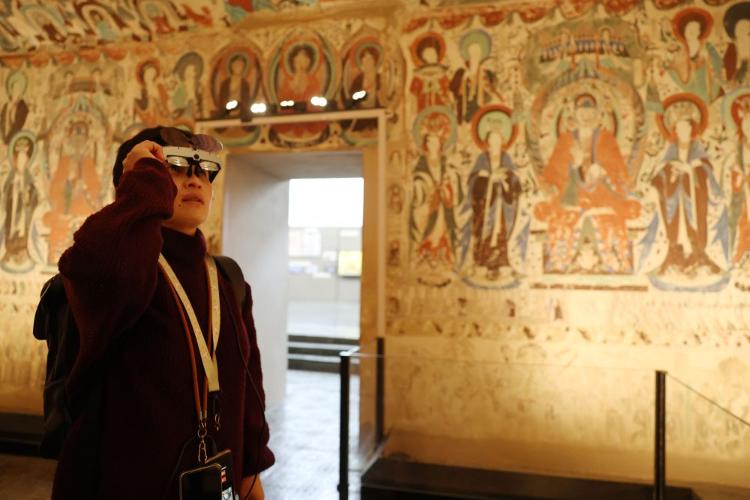 2025年10月30日,在敦煌石窟文物保护研究陈列中心,游客使用AR设备在复制洞窟参观体验。