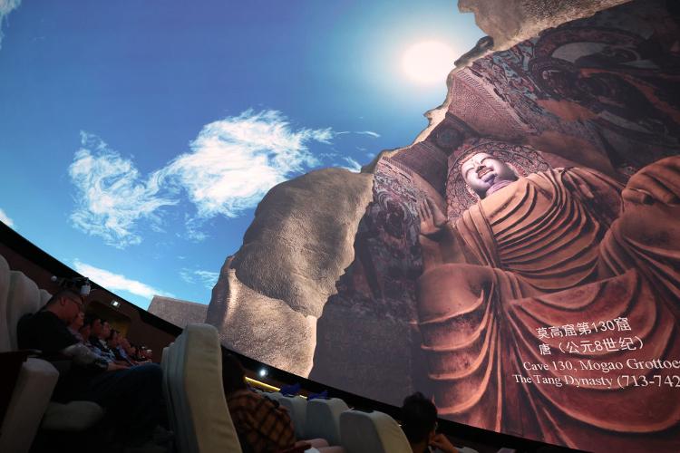 2024年9月4日,游客在敦煌莫高窟数字展示中心观看球幕电影《梦幻佛宫》。