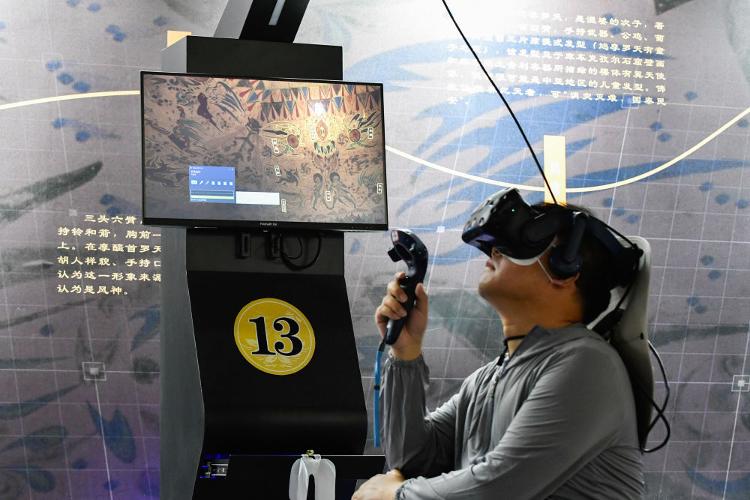 2024年7月22日,一名游客在敦煌莫高窟“寻境敦煌——数字敦煌沉浸展”上借助VR设备沉浸式游览莫高窟第285窟虚拟场景。“寻境敦煌”综合运用了VR虚拟现实、三维建模、游戏引擎的物理渲染和全局动态光照等新技术,高精度立体还原了莫高窟第285窟。游客戴上VR眼镜,不仅可以零距离观赏壁画、360度自由探索洞窟细节,还能“飞升”到窟顶,身临其境参与壁画故事情节,沉浸式感受敦煌文化的魅力。