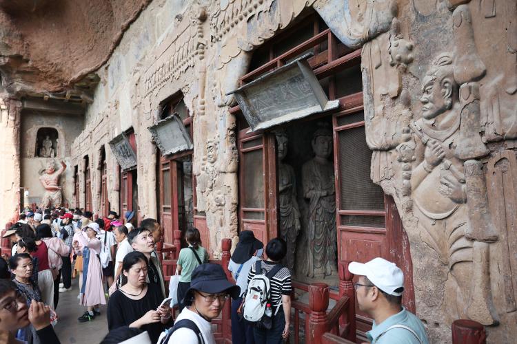 2025年7月16日顺配宝,游客在麦积山石窟参观。