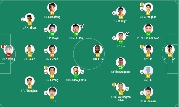前锋:10-奥莫伊胡安弗(F)、29-谭龙、35-彭欣力(74'22-王禹)