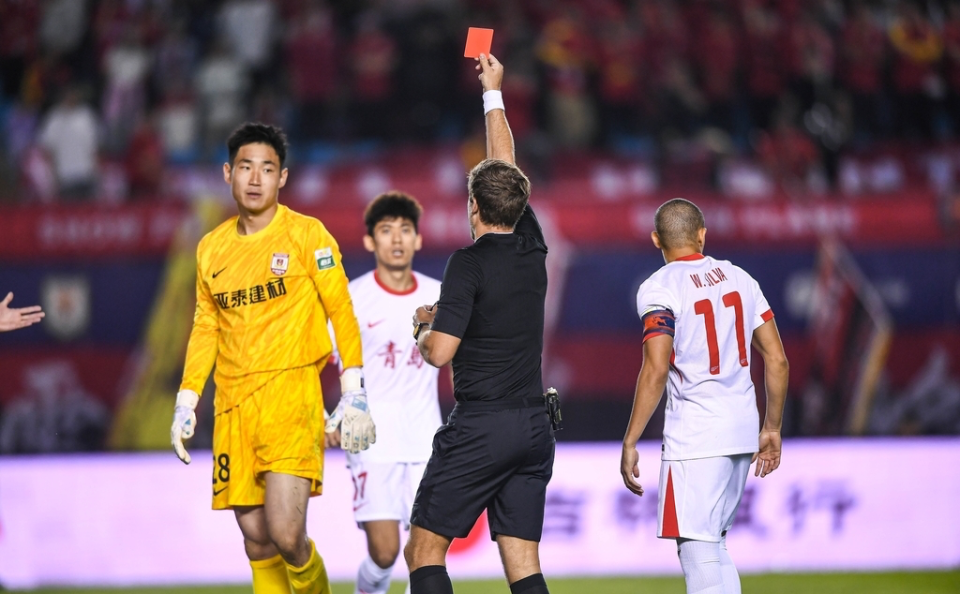 第8分钟,兰克尔-泽获得单刀机会,被出击的王智峰放倒,主裁果断判罚红牌罚下王智峰,亚泰开场8分钟就少打一人。